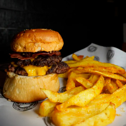Dos hamburguesas jugosas, doble queso, mermelada de tocino y salsa especial. Con tocino crujiente y papas de doble cocción.