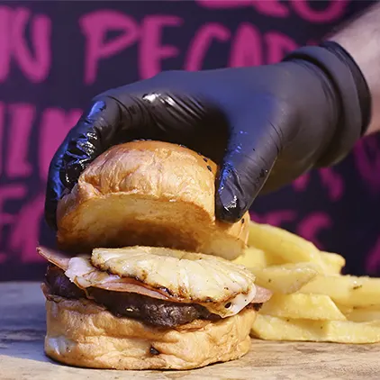 Hamburguesa artesanal 150 gr + Queso Edam + Jamón Ahumado + Rodaja de Piña + Porción de Papas.